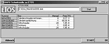 Nach Auswahl der Schnittstelle ETOS können Sie über den Start-Knopf das Schnittstellenprogramm aufrufen, welches Ihnen die gespeicherten Aufträge anzeigt. Durch Auswahl eines Auftrages werden die Daten in die CAR-SYSTEMS-Schnittstelle übernommen und durch OK in den Auftrag gespeichert.